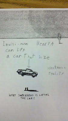 These are all so clever! I think Noah's is my favorite; he's really thinking outside the box! I also love that Henry's invisible man has average strength, and the car is a prop. They are really going around convention and expectations, and it's exciting that they each came up with something so unique.